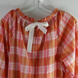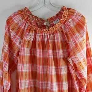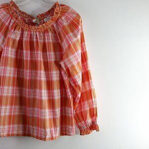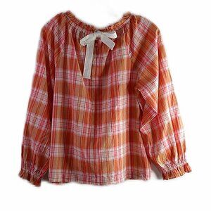 J. Crew- Orange/Pink Plaid Long Sleeve Tie Neck Top - Small