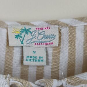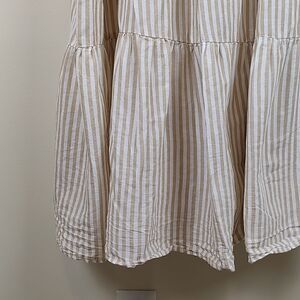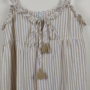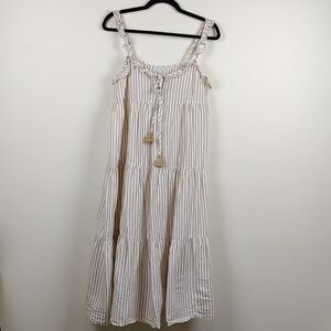 J. Crew Original Beachwear Tan and White Striped Tiered Midi Dress. This dress features a tassel tie keyhole closure in the front, and a ruffle around the neckline and adjustable straps. Easy going, beachy dress in 60% linen and 40% cotton. Size Small.