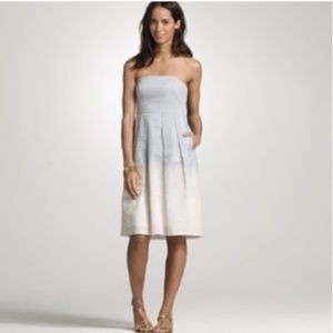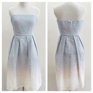 Gorgeous strapless dress from J. Crew! A beautiful light blue color on the top that fades to a cream and then ivory color at the hem. 100% cotton w/ a full lining and zipper in the back. Has boning in the bodice as well as a strap that hooks in the back to help keep this strapless dress up! Skirt has some subtle but beautiful pleats and even has pockets.