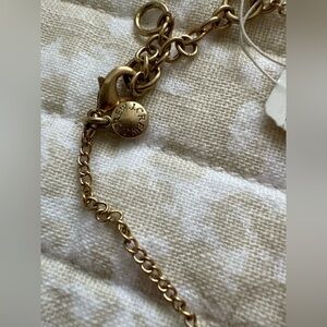 Romantic and modern all at once, this J. Crew necklace features pretty pastel "petals" and geometric shapes in shades of peach, green, yellow, and beige accented by clear rhinestones on an antiqued brass gold tone hardware.