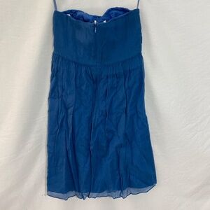 This is a cute and comfortable strapless 100% silk crepe strapless mini dress. It is fully lined and has a cotton corset with boning at the bust with it's own zipper. There is an exterior zipper with hook n eye closure. Dry Clean only. Approximately 24" long. I am 5'2" and it came to my knees, I wore it once.