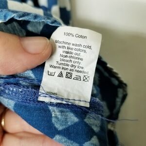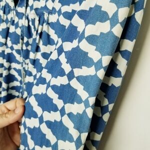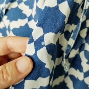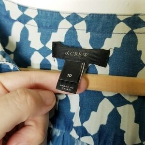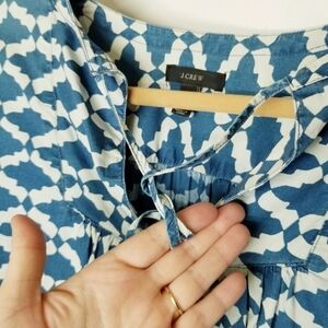 J. Crew Peasant Top Tie Neck Blue White Geometric Design Cotton Size 10 EUC