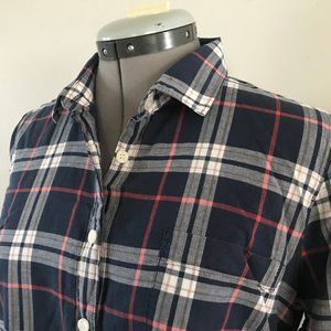 Navy plaid J.Crew button down in lightweight cotton poplin ladies sz medium. Very soft material, this would be great for layering this fall. Pearlized buttons. Patch pocket on breast. In good condition. See measurements below.
