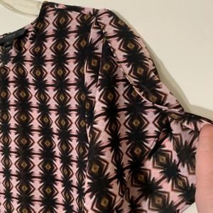 This is a beautiful J. Crew blouse. Beautiful geo print called shadow diamond. Curved hem. Petal sleeve. Keyhole back with a button closure. Great condition, no flaws. Material content: 100% polyester. Measurements: