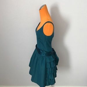 31" length. 15.5" armpit to armpit. Teal blue color with removable silk belt. Beautiful dress in excellent condition!