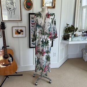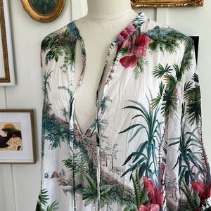 Vibrant tropical print coverup. Features lush green, blue, and red foliage. Lightweight and stylish. Perfect for beach days.