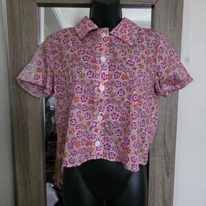 Vibrant floral print. Short sleeves. Button-up front. Perfect for casual wear.