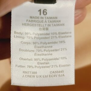 Women's pink madras plaid one piece v-neck swimsuit by J. Crew, size 16. Tie-shoulders. Swimsuit is a fabric blend of polyester and elastane with mesh lining and removable padding. Excellent pre-owned condition overall; hygiene strip is gone.