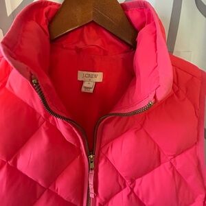 Stylish quilted vest. Features a vibrant pink color. Front zipper closure. Two front pockets.