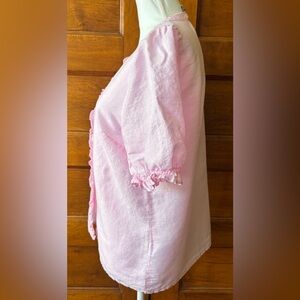 Pink linen and cotton blend blouse with ruffle details and button-up front. Perfect for a casual or dressy look.