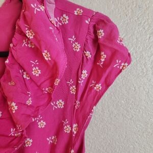 J. Crew pink dress. Short sleeves. Ruffle trim. Front faux wrap style. Midi style. Floral print.