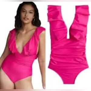 Dive into style with this vibrant pink one-piece swimsuit from J. Crew, featuring a dramatic ruffled neckline and a flattering fit. The bold color and elegant design make it a standout choice for any beach or poolside occasion. J. Crew Pink Ruffled One-Piece Swimsuit NWT Multiple Sizes 4, 6, 22 best seller