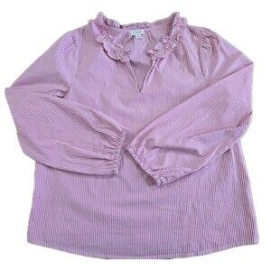 This J. Crew Pink Striped Top in size medium is a versatile and stylish piece perfect for various occasions. With a split neck and ruffle accents, this top adds a touch of femininity to its classic striped design. Made from a blend of spandex and cotton, this lightweight and breathable blouse is easy to care for and suitable for all seasons. Ideal for travel, casual outings, or business settings, this top offers a comfortable fit with a touch of boho and cottagecore flair, making it a must-have for any fashion-forward woman's wardrobe.