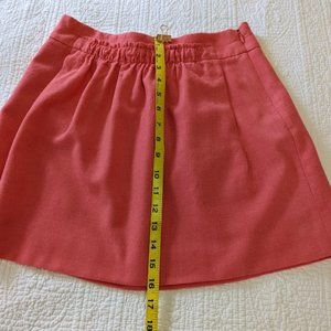 Lightweight wool miniskirt by J. Crew. Color is pink/coral, pleated, with pockets. Closure is side-zip and is fully lined. Size 2 with flat lay measurements of 28" waist (sits low on hips) and 16" length. EUC with no wear, tears or stains.
