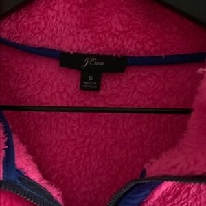 Vibrant pink fleece sweatshirt. Features blue trim and accents. Cozy and stylish.