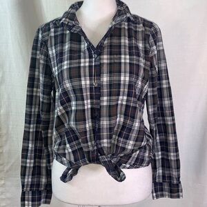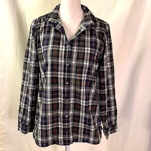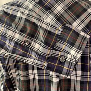 Classic, preppy plaid with navy/ blue checkering and pops of green, red, and yellow. Single breast pocket, buttoned cuffs.