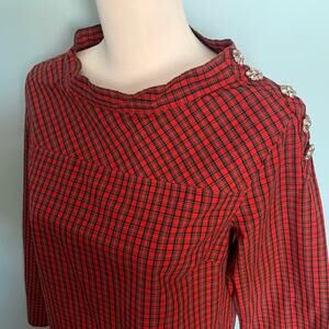 Festive red and black plaid shirt is oversized with high/low hem, long sleeves, and wide funnel neck with rhinestone buttons on one shoulder. Great for the holidays! Pair with jean or leggings and cute boots for a casual look or wear it with a skirt and some heels for dressier event. Lightly worn, in excellent used condition