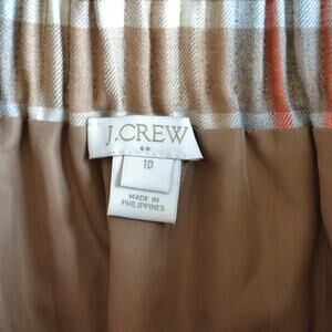 This is a stylish J. Crew plaid tartan mini skirt in size 10. The primary color is brown and it's perfect for adding a touch of classic style to your wardrobe.