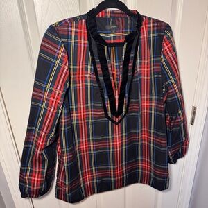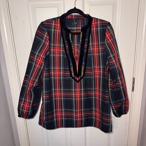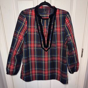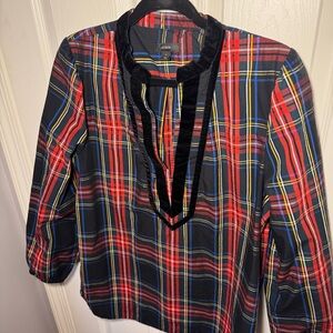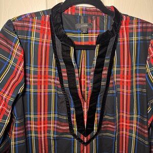 Plaid long sleeve tunic from J. Crew with black velvet trim around neckline. Side splits. Elastic at wrist.