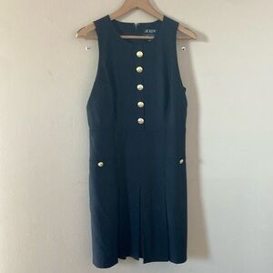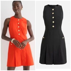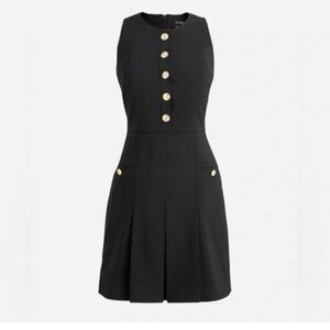 This is a sleeveless black mini dress from J.Crew, featuring a structured yet elegant design. It has a round neckline and a button-down front adorned with gold-tone buttons, giving it a polished and timeless appeal. The dress includes pleats that add volume and movement to the skirt, as well as two front pockets accented with matching gold buttons for a refined touch.