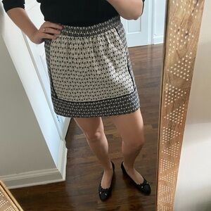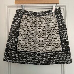 This skirt from J. Crew features a black and white textured colorblocked pattern, black ribbon piping accents, 2 front seam pockets, an exposed gold zipper in the back, and is fully lined!