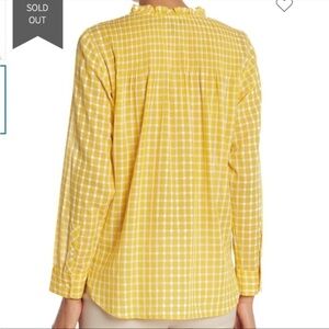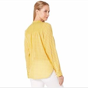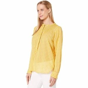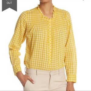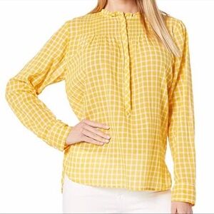 J. Crew Popover Gingham Checkered Yellow and White Pleated Ruffle Trim Top