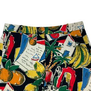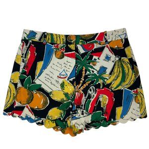 This J. Crew women's Postcard Print High Waist Short makes a statement due to it's flat front, higher rise, scalloped trim, zip fly with slide/button, pockets, still sealed back pockets and multicolor novelty fruit design.