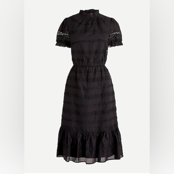J.Crew black puff-sleeve daisy-chain dress. Soft cotton lace with ruffle trim and tiered hem. Elastic waist, back button closure, no pockets. Machine washable.