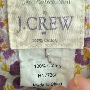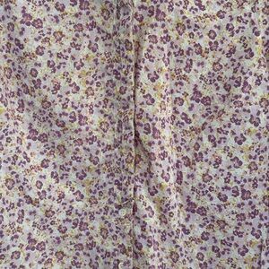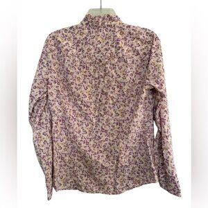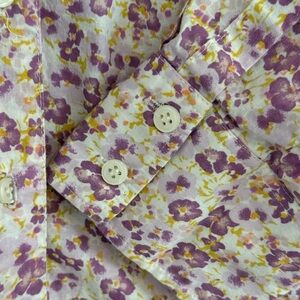 Stylish button-down shirt with a floral pattern. Features a blend of purple and yellow flowers. Perfect for casual or formal wear. Ruffled collar and pleated button front.