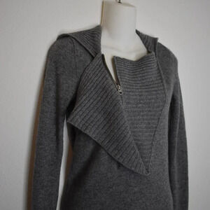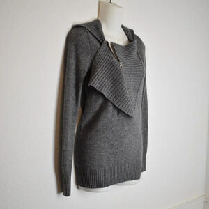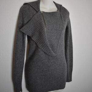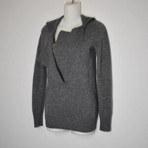 Pre-owned, good condition. No visible holes or stains. Normal signs of wear. Minimalist, neutral marled gray knit. Shawl ribbed collar. Quarter Zip. Pullover. Long sleeves with ribbed cuffs. Ribbed hemline. Soft. Size per tag: XS (Extra Small). Knit blend: 55% Wool/ 30% Nylon/ 15% Cashmere. Size per tag does not guarantee desired fit, please see pictures for measurements.