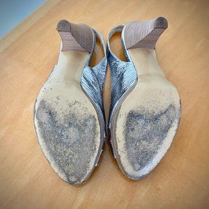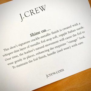 These unique pumps from J. Crew are made of soft Italian leather. The crackle-metallic finish is created with a thin layer of metallic foil over Italian suede, meant to wear gently over time. Leather upper, leather lining, synthetic sole. Stacked heel = 3.75" high. Made in Italy. Some normal wear on heels and soles. See close-up photos for any wear on the inside lining. These shoes are so unique and have lots of life left. They have been carefully stored in original box and tissue and will ship to you the same way.