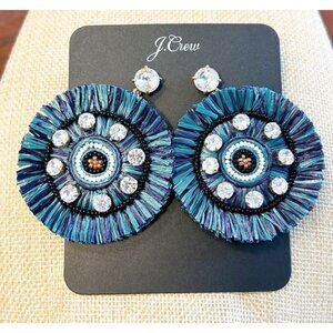 J. Crew Raffia Fringe Disc Earrings in Blue Green- NWT