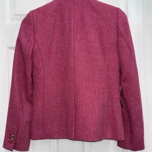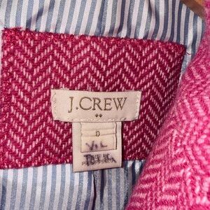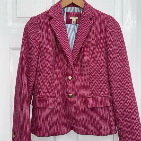 Stylish #Jcrew pink #blazer with herringbone pattern. Features gold buttons and classic lapel. Ideal for versatile wear.