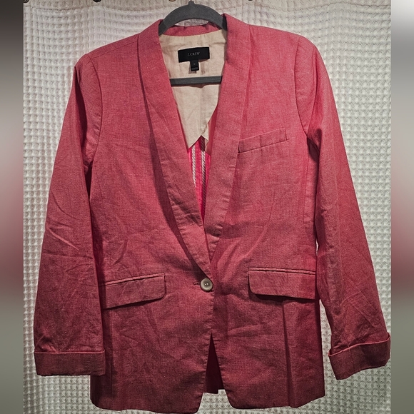 Tailored single-button blazer by J. Crew. Shawl-style lapels and flap pockets. Lightweight woven fabric with clean lines. Vibrant raspberry-pink tone for a bold look.