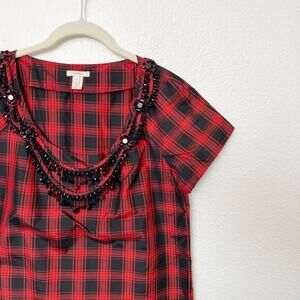 [J. Crew] Red Black Buffalo Plaid Eliza Jeweled Necklace Tartan Top Silk Size 6