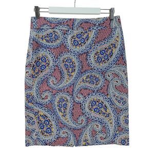 J. Crew's Number 2 Pencil Skirt in Size 8 features a vibrant red and blue paisley print, offering a bold yet sophisticated flair. Midi-length with a tailored fit, the skirt is lined and includes an invisible zipper for seamless wear.