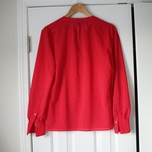 Stylish red button down shirt with white polka dots. Features delicate pleats and long sleeves. Perfect for any occasion.