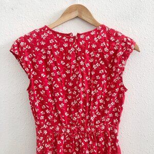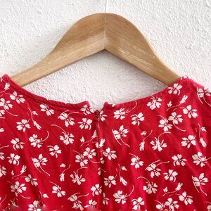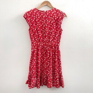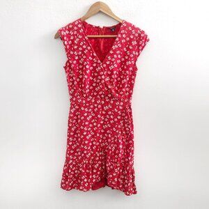 Chic red mini dress with floral pattern. Sleeveless design. Perfect for summer outings.