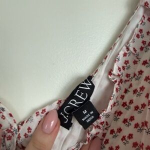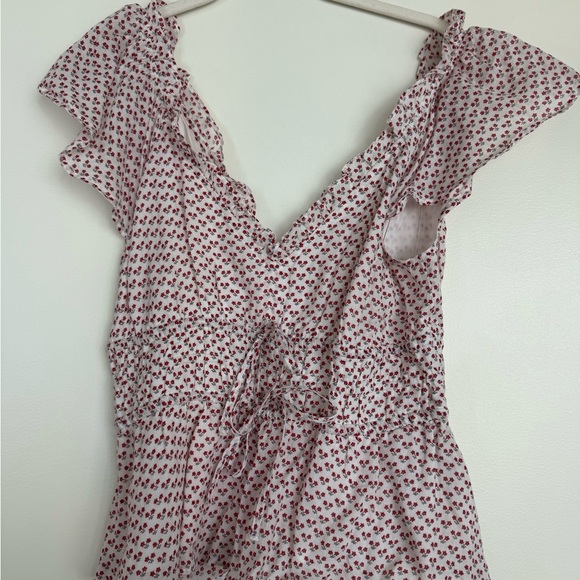 Elegant blouse with red floral pattern. Features ruffle sleeves and a flattering fit.