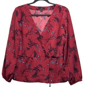 Beautiful deep red J.Crew blouse featuring a floral print in navy and light blue. Designed with a flattering V-neckline, wrap-front style, long sleeves with elastic cuffs, and a gently cinched waist for a feminine silhouette. Made from lightweight 100% polyester, this top is comfortable and versatile—perfect for both casual wear and dressier occasions.