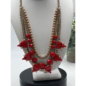J. Crew Red Pink Peach Gold Tone Layered Multi Strand Rhinestone Necklace