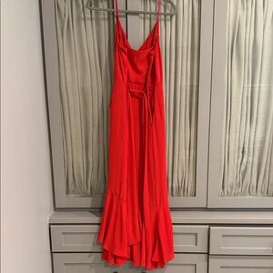 Turn heads with this stunning red ruffle dress. Perfect for any occasion, its vibrant color and elegant design make it a must-have in your wardrobe. In excellent preowned condition.