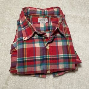Vibrant plaid design. Button-down style. Ideal for casual outings.
