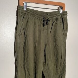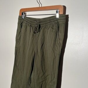 Upgrade your casual wardrobe with these comfortable J. Crew relaxed cotton pants in an earthy olive green, size 8. Perfect for laid-back days, these pants feature an elastic waistband with a drawstring for an adjustable fit, along with cuffed hems that add a touch of style. Crafted from 100% cotton, they offer a breathable, relaxed fit ideal for year-round wear.