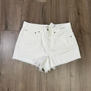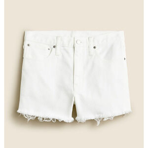 Description: Elevate your summer wardrobe with J Crew's Relaxed Denim High Rise Frayed Hem Shorts. These white shorts offer a relaxed-fit design that exudes effortless, laid-back style with a modern, fashion-forward twist. Perfect for casual and urban settings, they feature a vintage-inspired design with a distinctive frayed hem, adding an artsy, eclectic touch. Despite a faint mark on the front waistband, these shorts remain a unique, statement-making piece, embodying the essence of bohemian, free-spirited fashion. Capture a nonchalant, authentic vibe with these versatile, on-trend shorts, perfect for any chic, edgy look.