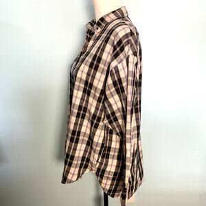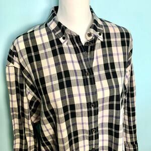 Features a white, black and purple plaid in a button front shirt with button collar. In excellent used condition. Missing material/care tag.