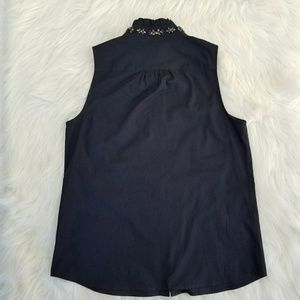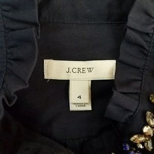 Preowned top by J. Crew. Navy blue color, with multi-colored rhinestones, sleeveless with a ruffled collar.