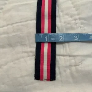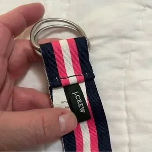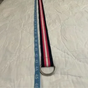 Excellent used condition D-ring belt by J crew. Shows very little wear, if any. Fully adjustable, total length of belt is 45” including buckle but can be as small as you want. Thick ribbon, has some substance, isn’t just a grosgrain ribbon. Navy blue, pink, and white stripe- a really nice example of the American heritage or preppy aesthetic. Style tags: Spring, golf, Ivy League