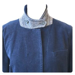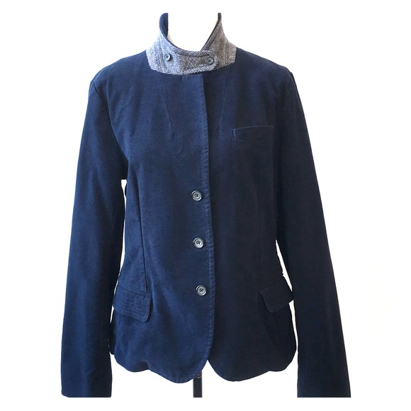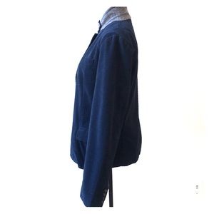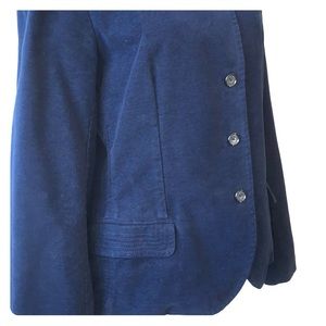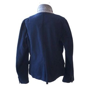 Equestrian show jacket from J. Crew in midnight blue/true navy. Sophisticated styling including: interior lined sleeves w/ tonal ribbon detailing, left interior breast pocket, and an expandable four button front which helps to create an elevated twist on a classic silhouette. Dry clean only. Measurements (laying flat) as follows: