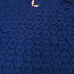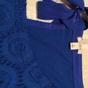 Size large. Truest color in second photo--gorgeous cobalt. No trades and no PayPal